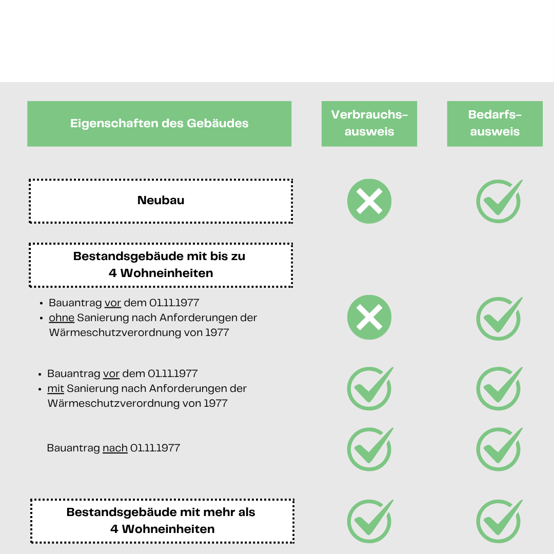 Beim Energieausweis für Wohngebäude wird zwischen einem Verbrauchsausweis und einem Bedarfsausweis unterschieden. Welcher Ausweis angewendet werden muss, hängt von den gesetzlichen Vorgaben sowie den Eigenschaften des Gebäudes ab.